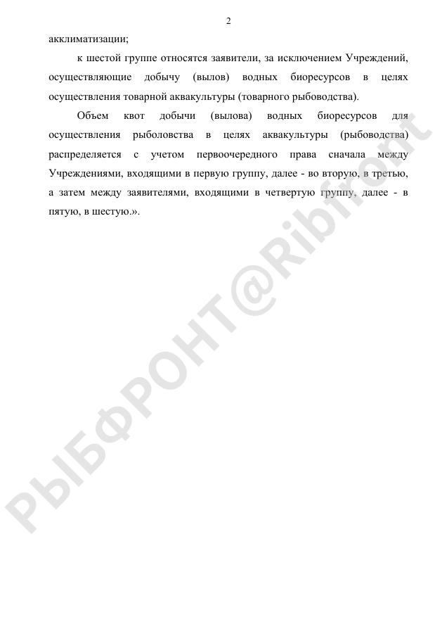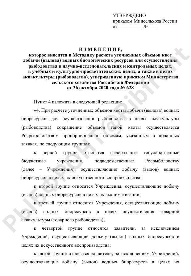 Предлагается предоставить приоритет учреждениям, занимающимся искусственным воспроизводством водных биоресурсов. Ко второй группе относятся структуры, которые занимаются выловом для акклиматизации водных биоресурсов, к третьей — для товарного рыбоводства.