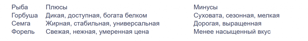 Главная разница между этими тремя видами — в жирности. Атлантический лосось и откормленная форель содержат до 15 % жира, благодаря чему их филе получается мягким, нежным и сливочным. Горбуша же — более сухая и плотная, с жирностью 5-6 %. На сковороде она легко пересушивается, а при запекании требует маринада.